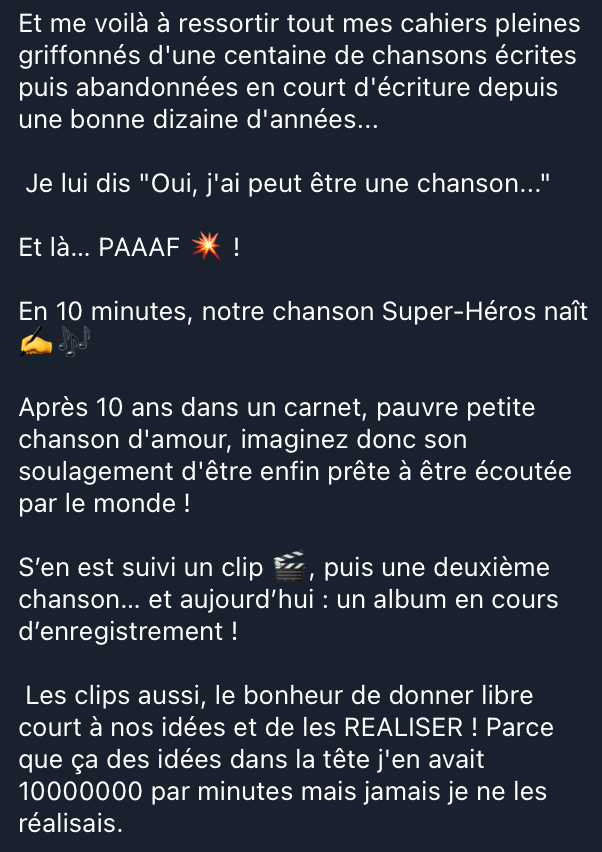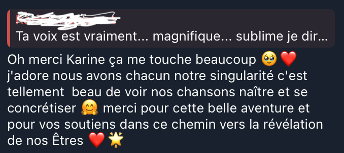 Feedbacks précis, intentions clarifiées, arrangements affinés. Tu passes de “c’est bien” à “ça raconte vraiment quelque chose”.